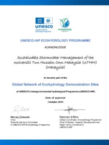 Universiti Tun Hussein Onn Malaysia (UTHM) marked another history for being recognised at international level for the UNESCO Ecohydrology Demonstration Sites through the UNESCO Intergovernmental Hydrological Programme (UNESCO-IHP) certification, recently. The Sustainable Stormwater Management project was accepted as part of the Ecohydrology Demostration Sites Global Network , certified on 1 October, 2024.
